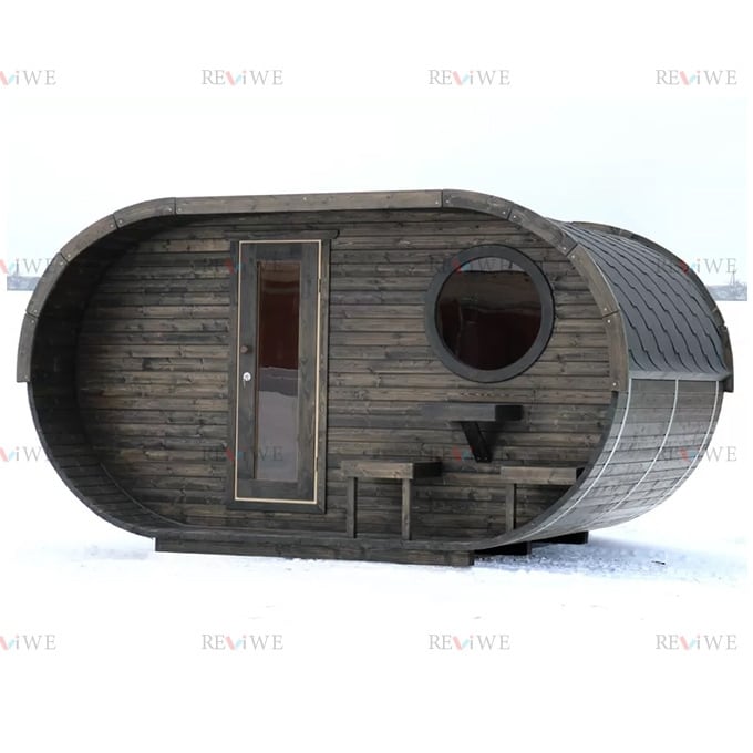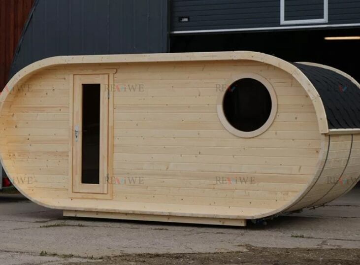 北欧スタイルの木製楕円サウナハウス。丸型よりも広々とした空間を確保し、内部の快適性を高めています。自宅の庭や別荘、キャンプ場などに設置でき、家族や友人とプライベートサウナを楽しめます。